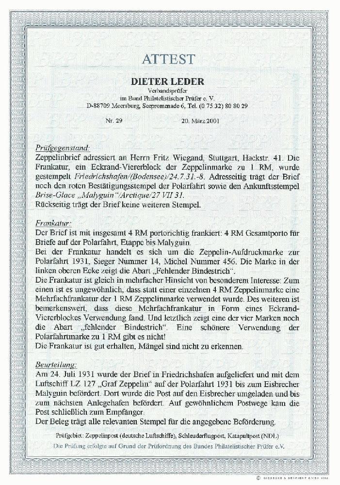 | Prüfgebiet: | Deutsches Reich Zeppelinpost (Belege) |