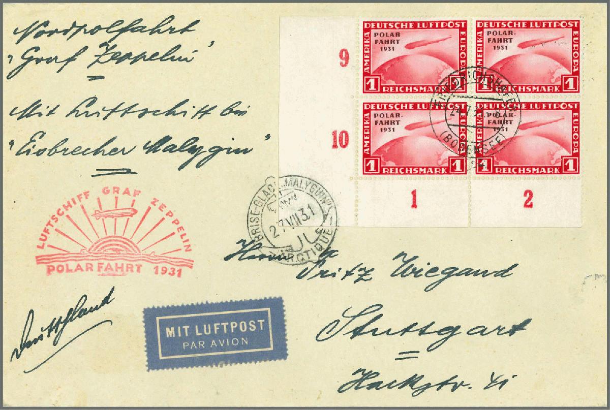 | Zusatzinformationen und Suchstichworte: | Rapp Auktion 2022 Auktionstermin: 2. - 7. Mai 2022 Los 958 Deutsches Reich, 1923/32 Weimarer Republik Polarfahrt 1 RM lilarot, Viererblock aus der linken unteren Bogenecke mit Bogenränder, die linke obere Marke (Pos. 41 des Bogens) ohne Bindestrich. Portogerechte Frankatur auf Zeppelin-Brief bis zum Eisbrecher Malyguin in tadelloser Erhaltung. Attest Lederer. Zuschlag 2.000,00 CHF |
