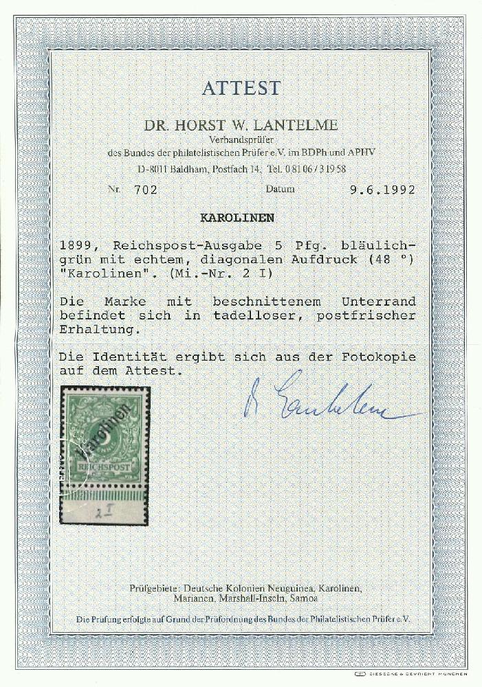 | Zusatzinformationen und Suchstichworte: | Rapp Auktion 2022 Auktionstermin: 2. - 7. Mai 2022 Los 962 Deutsche Kolonien Karolinen 5 Pf. bis 50 Pf. mit diagonalem Aufdruck, alle 5 Werte in tadellos postfrischer Erhaltung. Atteste Steuer oder Jäschke-L. Zuschlag 2.100,00 CHF |