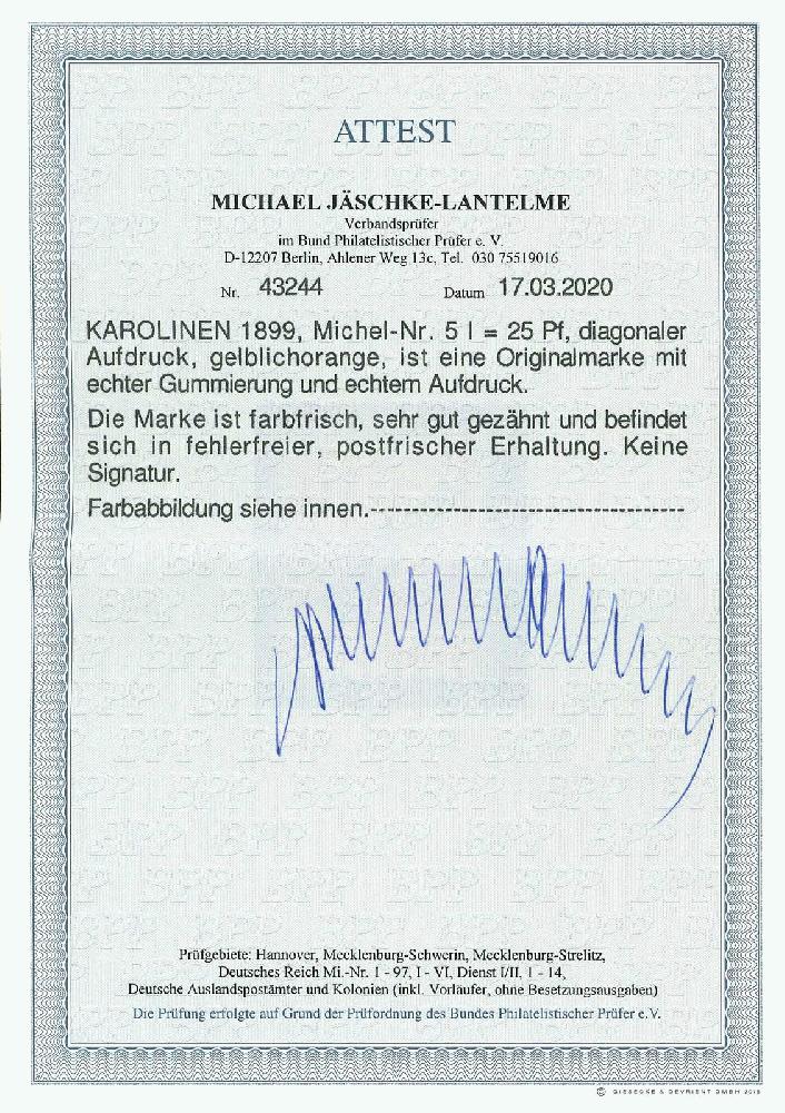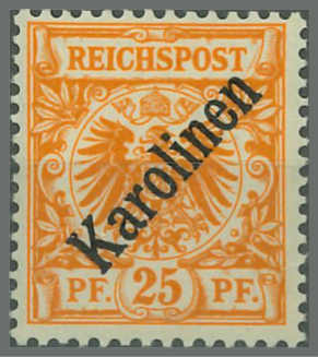 | Zusatzinformationen und Suchstichworte: | Rapp Auktion 2022 Auktionstermin: 2. - 7. Mai 2022 Los 962 Deutsche Kolonien Karolinen 5 Pf. bis 50 Pf. mit diagonalem Aufdruck, alle 5 Werte in tadellos postfrischer Erhaltung. Atteste Steuer oder Jäschke-L. Zuschlag 2.100,00 CHF |