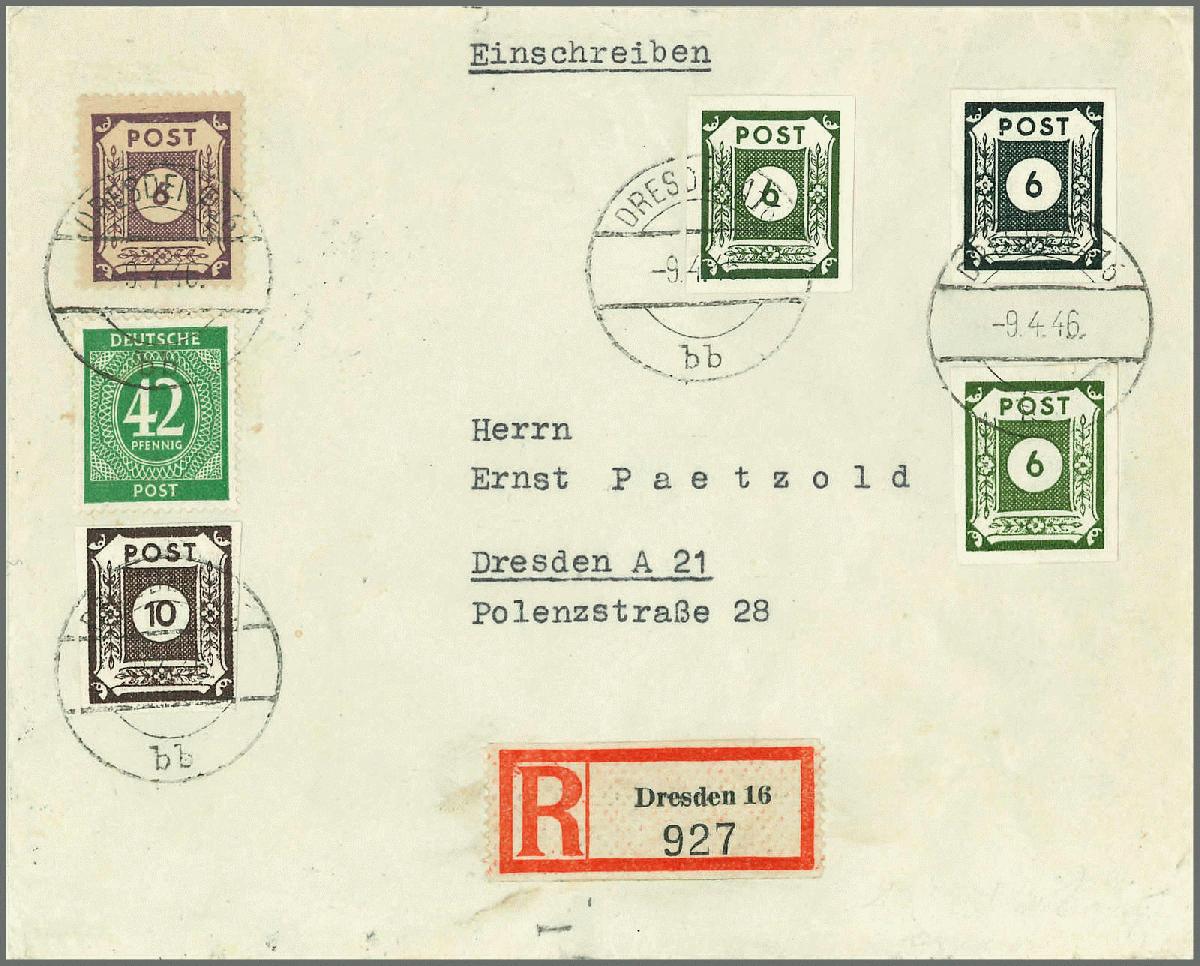 | Zusatzinformationen und Suchstichworte: | Rapp Auktion 2022 Auktionstermin: 2. - 7. Mai 2022 Los 981 Sowjetische Zone Ostsachsen: 6 Pfg. grünlichschwarz, mit Beifrankatur auf portogerechtem Einschreibe-Brief von DRESDEN 9.4.46, lokal addressiert. Tadellose Erhaltung. Laut Attest Ströh sind portogerechte Briefe mit dieser Marke selten. Zuschlag 1.000,00 CHF |