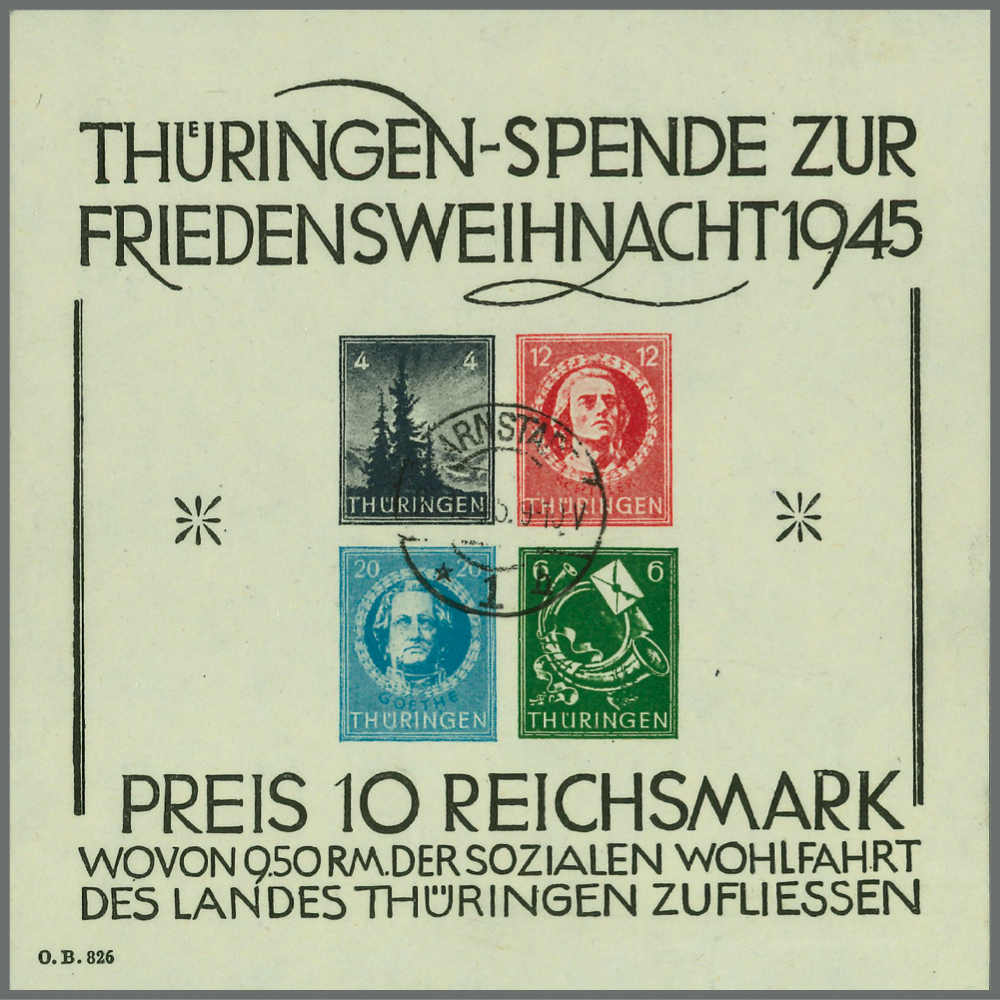 | Zusatzinformationen und Suchstichworte: | Rapp Auktion 2022 Auktionstermin: 2. - 7. Mai 2022 Los 984 Sowjetische Zone Weihnachts-Block ohne Durchstich, tadellos erhalten und sauber gestempelt ARNSTADT 23.12.45. Attest Ströh. Zuschlag 1.600,00 CHF |
