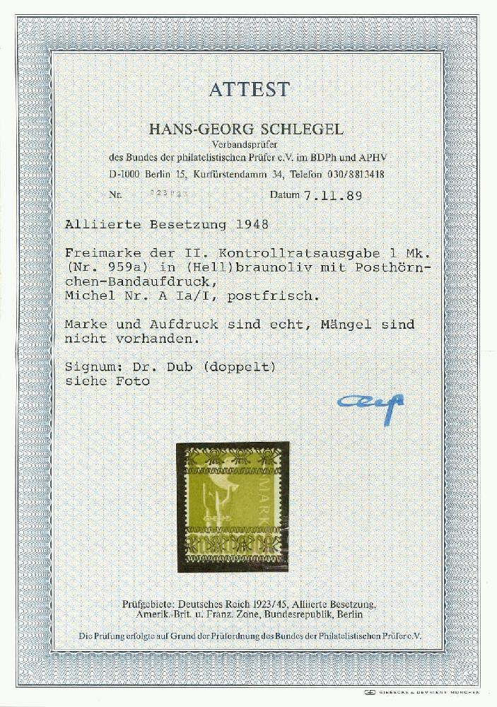 | Zusatzinformationen und Suchstichworte: | Rapp Auktion 2022 Auktionstermin: 2. - 7. Mai 2022 Los 989 Bizone 1 M hellbraunoliv, Posthörnchen Band-Aufdruck, tadellos postfrisch ohne Falz. Attest Schlegel. Zuschlag 1.200,00 CHF |