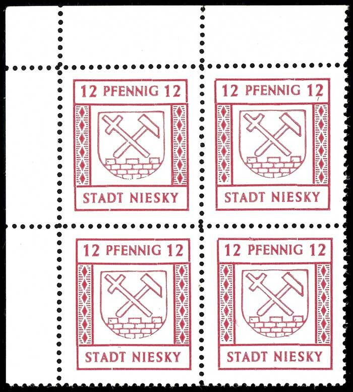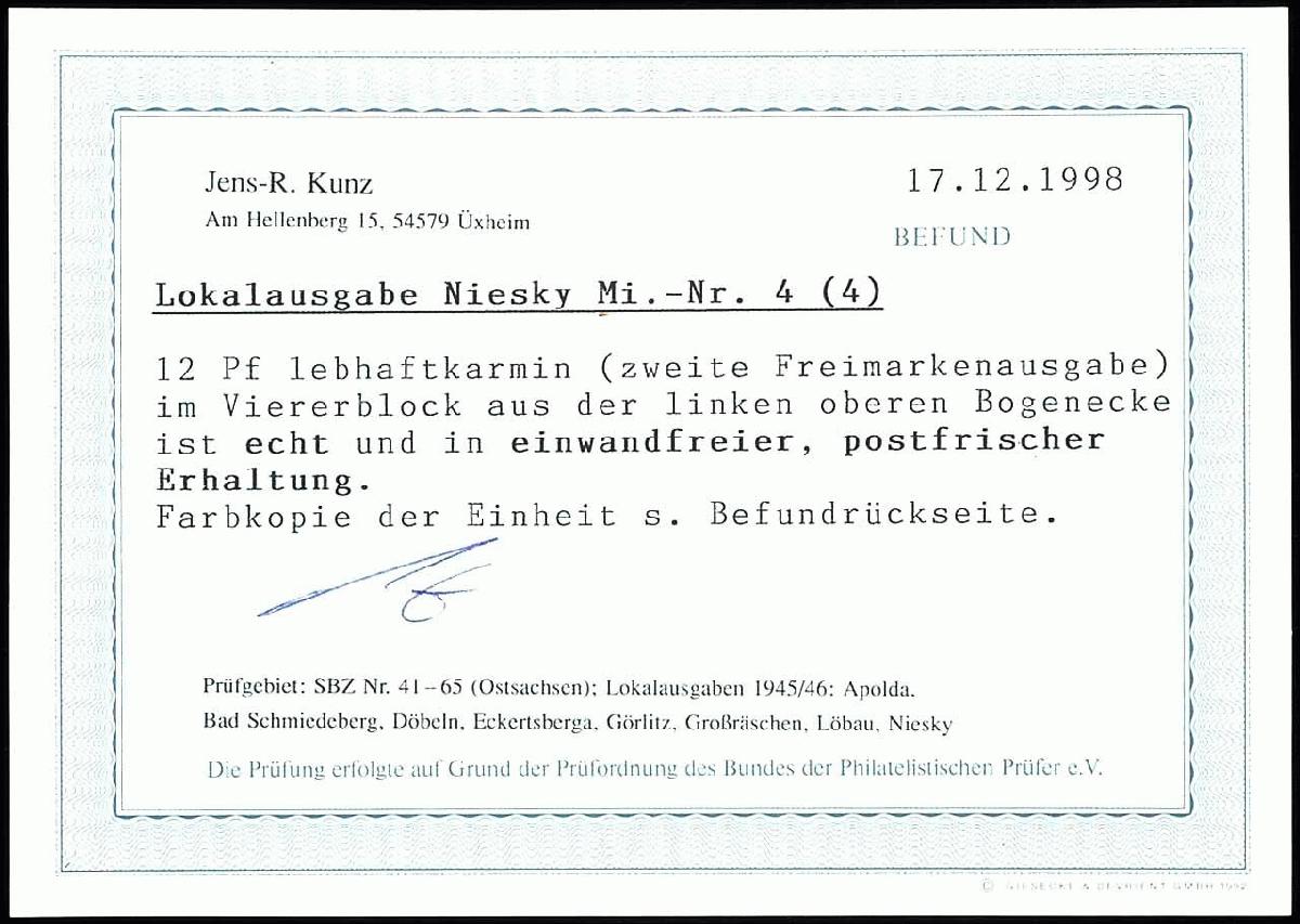 | Zusatzinformationen und Suchstichworte: | Dr. Reinhard Fischer 187. Auktion Auktionstermin: 15. Juli 2022 Los 5389 Deutsche Lokalausgabe Niesky 12 Pfg Freimarke, Eckrandviererblock links oben, tadellos postfrisch, Fotobefund Kunz BPP, Mi. 400.- Ausruf 100,00 EUR |