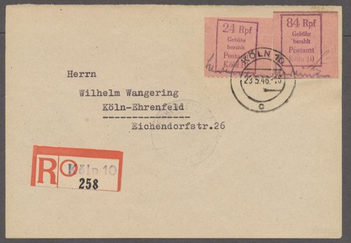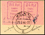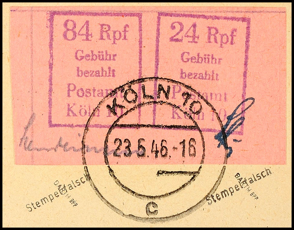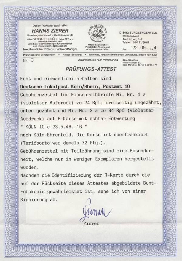 | Zusatzinformationen und Suchstichworte: | Echt und einwandfrei erhalten sind Deutsche Lokalpost Köln/Rhein, Postamt 10 Gebührenzettel für Einschreibbriefe Mi. Nr 1 a (violetter Aufdruck) zu 24 Rpf., dreiseitig ungezähnt, unten gezähnt und Mit. Nr. 2 a zu 84 Rpf. (Violetter Aufdruck) auf R-Karte mit echter Entwertung "KÖLN 10 c 23.5.46.-16" nach Köln-Ehrenfeld. Die karte ist überfrankiert (Tarifporto war damals 72 Pfg.). Gebührenzettel mit Teilzähnung sind eine Besonderheit, welche nur in wenigen Exemplaren hergestellt wurden. Nachdem die Identifizieren der R-Karte durch die auf der Rückseite dieses Atteste abgebildete Bunt-Fotokopie gewährleistet ist, ehe ich von einer Signierung ab. |