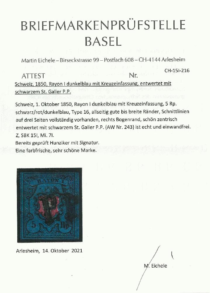 | Zusatzinformationen und Suchstichworte: | Rapp Auktion 2022 Auktionstermin: 2. - 7. Mai 2022 Los 113 Rayon I, dunkelblau ohne Kreuzeinfassung Type 16, sehr farbenfrisch mit allseitig guten bis breiten Rändern, sauber aufgesetztes P.P. aus dem IX. Postkreis und in tadelloser Erhaltung. Atteste Renggli und Eichele, gez. Hunziker. Zuschlag 440,00 CHF |