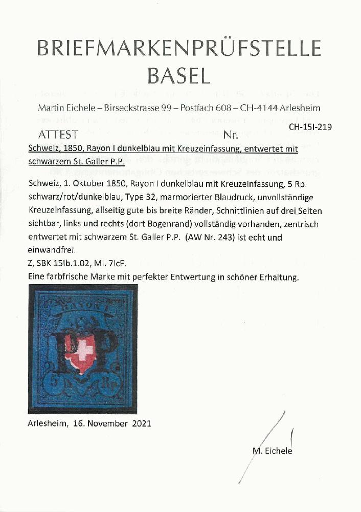 | Zusatzinformationen und Suchstichworte: | Rapp Auktion 2022 Auktionstermin: 2. - 7. Mai 2022 Los 116 Rayon I, dunkelblau ohne Kreuzeinfassung Type 32, unvollständige Kreuzeinfassung, leuchtend frisch mit dekorativ aufegsetztem P.P. aus dem Postkreis St. Gallen (AW 243) in perfekter Erhaltung. Marken mit unvollständiger Einfassung sind wesentlich seltener als mit vollständiger Einfassung. Attest Eichele, Gutachten Rellstab. Zuschlag 820,00 CHF |