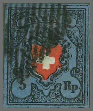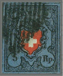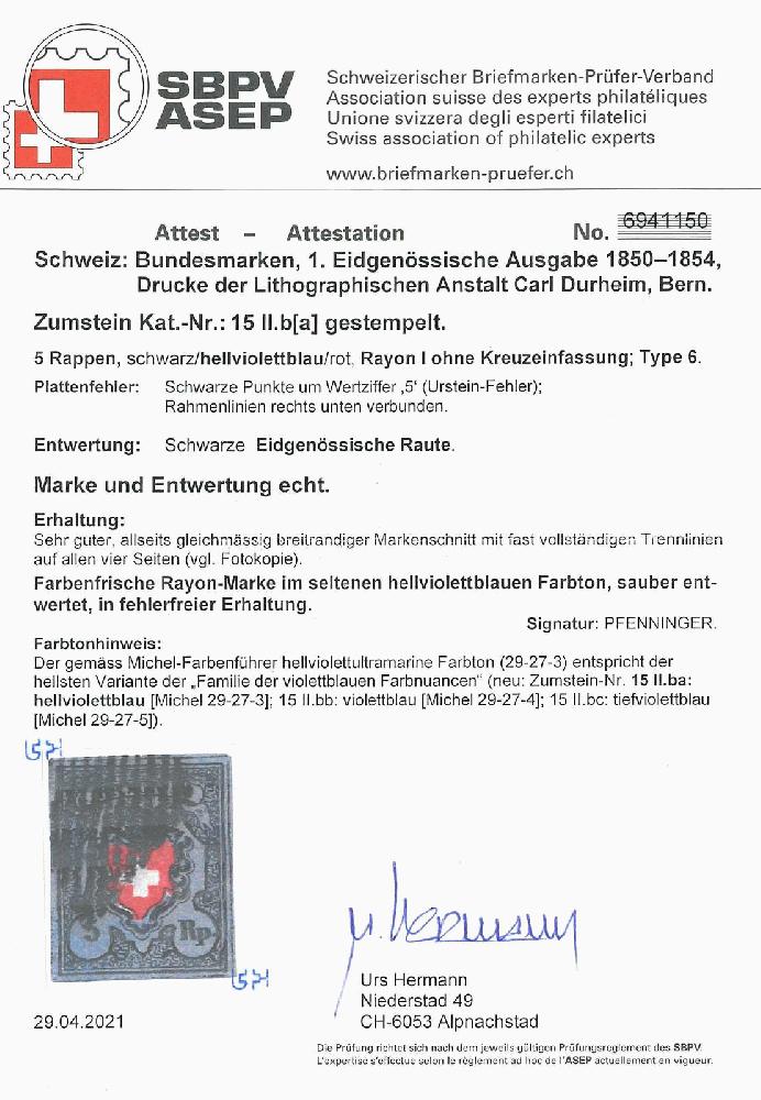| Zusatzinformationen und Suchstichworte: | Rapp Auktion 2022 Auktionstermin: 2. - 7. Mai 2022 Los 121 Rayon I, dunkelblau ohne Kreuzeinfassung Type 6, hellviolettblaue Nuance, sehr frisch und breitrandig mit Bundesraute. Bezüglich der violettblauen Nuance verweisen wir auf das neue Attest von Hermann, welches im Internet ersichtlich ist. Zuschlag 550,00 CHF |