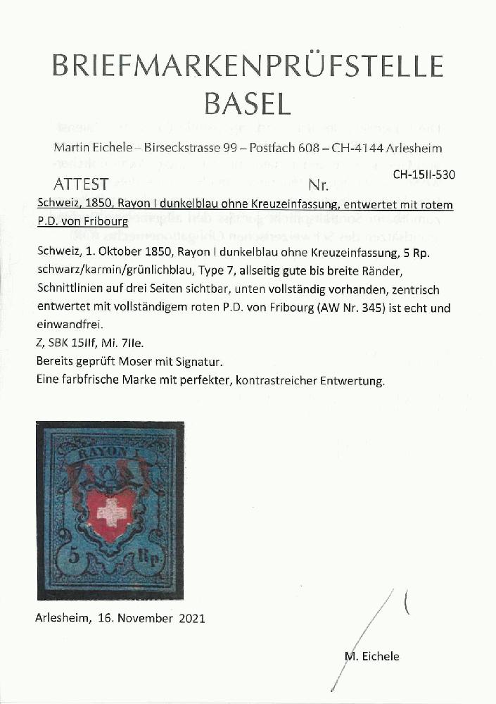 | Zusatzinformationen und Suchstichworte: | Rapp Auktion 2022 Auktionstermin: 2. - 7. Mai 2022 Los 124 Rayon I, dunkelblau ohne Kreuzeinfassung Type 7, frisch und hervorragend erhalten mit rotem PD von Fribourg (AW 345). Atteste Moser und Eichele. Zuschlag 750,00 CHF |