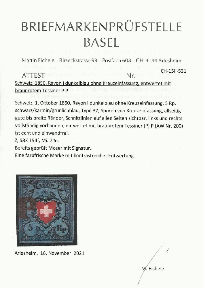 | Zusatzinformationen und Suchstichworte: | Rapp Auktion 2022 Auktionstermin: 2. - 7. Mai 2022 Los 138 Rayon I, dunkelblau ohne Kreuzeinfassung Type 37, Spuren der Einfassung, sehr frisch und tadellos mit Teilen eines braunroten (P)P aus dem Tessin (AW 200). Atteste Moser und Eichele. Zuschlag 550,00 CHF |