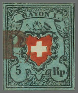 | Zusatzinformationen und Suchstichworte: | Rapp Auktion 2022 Auktionstermin: 2. - 7. Mai 2022 Los 138 Rayon I, dunkelblau ohne Kreuzeinfassung Type 37, Spuren der Einfassung, sehr frisch und tadellos mit Teilen eines braunroten (P)P aus dem Tessin (AW 200). Atteste Moser und Eichele. Zuschlag 550,00 CHF |