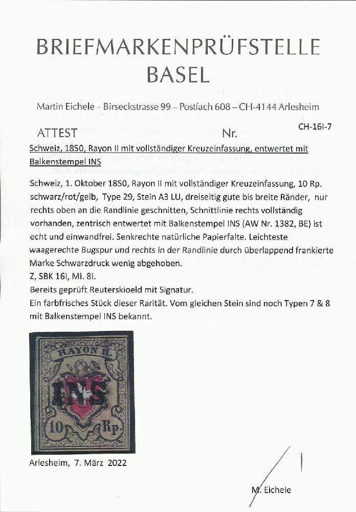 | Zusatzinformationen und Suchstichworte: | Rapp Auktion 2022 Auktionstermin: 2. - 7. Mai 2022 Los 139 Rayon II, gelb, ohne Kreuzeinfassung (Diverse)Type 29 LU vom Druckstein A 3 mit gut erkennbarer, vollständiger Kreuzeinfassung und zentrisch aufgesetztem Stabstempel INS. Die Marke ist sehr farbfrisch, an drei Seiten gute bis breite Ränder, nur rechts oben entlang der Randlinie geschnitten. Minimale Einschränkungen wie Bugspur bzw. Papierwellung etc. können bei dieser grossen Schweiz-Rarität akzeptiert werden. Betreffend Qualität verweisen wir auf die ausführlichen Atteste von Nussbaum und Eichele. Zuschlag 27.000,00 CHF |