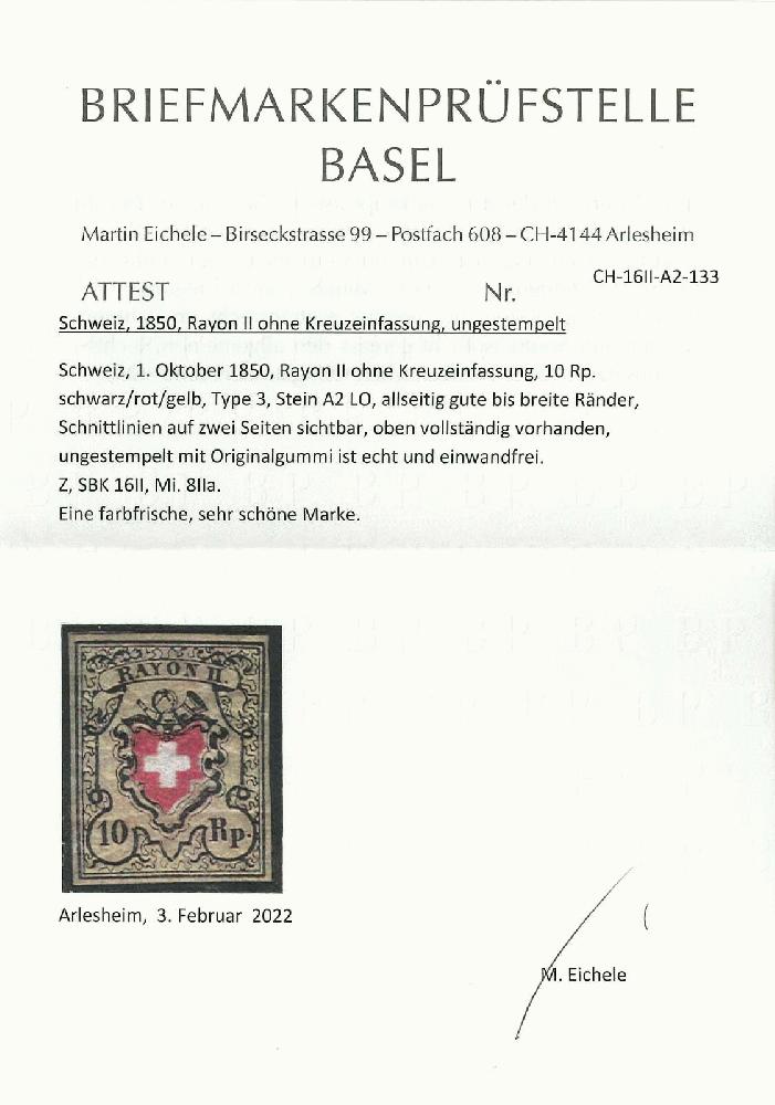 | Zusatzinformationen und Suchstichworte: | Rapp Auktion 2022 Auktionstermin: 2. - 7. Mai 2022 Los 142 Rayon II, gelb, ohne Kreuzeinfassung (Diverse) Type 3 LO, ungebraucht mit Original-Gummi, sehr frisch und in herausragender Erhaltung. Attest Eichele. Zuschlag 1.800,00 CHF |