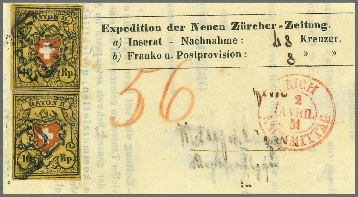 | Zusatzinformationen und Suchstichworte: | Rapp Auktion 2022 Auktionstermin: 2. - 7. Mai 2022 Los 145 Rayon II, gelb, ohne Kreuzeinfassung (Diverse) 2 Exemplare der Typen 17 und 34 LU, als senkrechtes Paar geklebt mit ZH-Rosetten auf Nachnahme-Ausschnitt der Neuen Zürcher Zeitung. Frische und fehlerfreie Erhaltung. Attest Rellstab. Zuschlag 360,00 CHF |