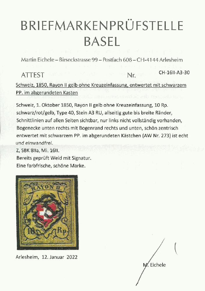| Zusatzinformationen und Suchstichworte: | Rapp Auktion 2022 Auktionstermin: 2. - 7. Mai 2022 Los 147 Rayon II, gelb, ohne Kreuzeinfassung (Diverse) Type 40 RU, frisch und tadellos aus der rechten unteren Bogenecke mit 3 Schnittlinien und schwarzem PP. im Kästchen (AW 273). Attest Eichele, signiert Weid. Zuschlag 260,00 CHF |