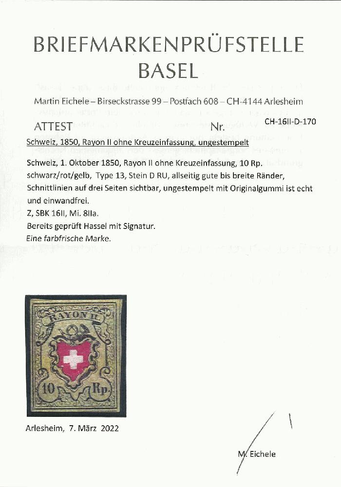 | Zusatzinformationen und Suchstichworte: | Rapp Auktion 2022 Auktionstermin: 2. - 7. Mai 2022 Los 150 Rayon II, gelb, ohne Kreuzeinfassung (Diverse) Type 13 RU, ungebraucht mit voller Originalgummierung, leuchtend frisch und tadellos. Attest Eichele, gez. Hassel. Zuschlag 600,00 CHF |