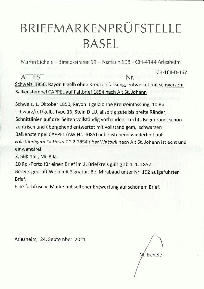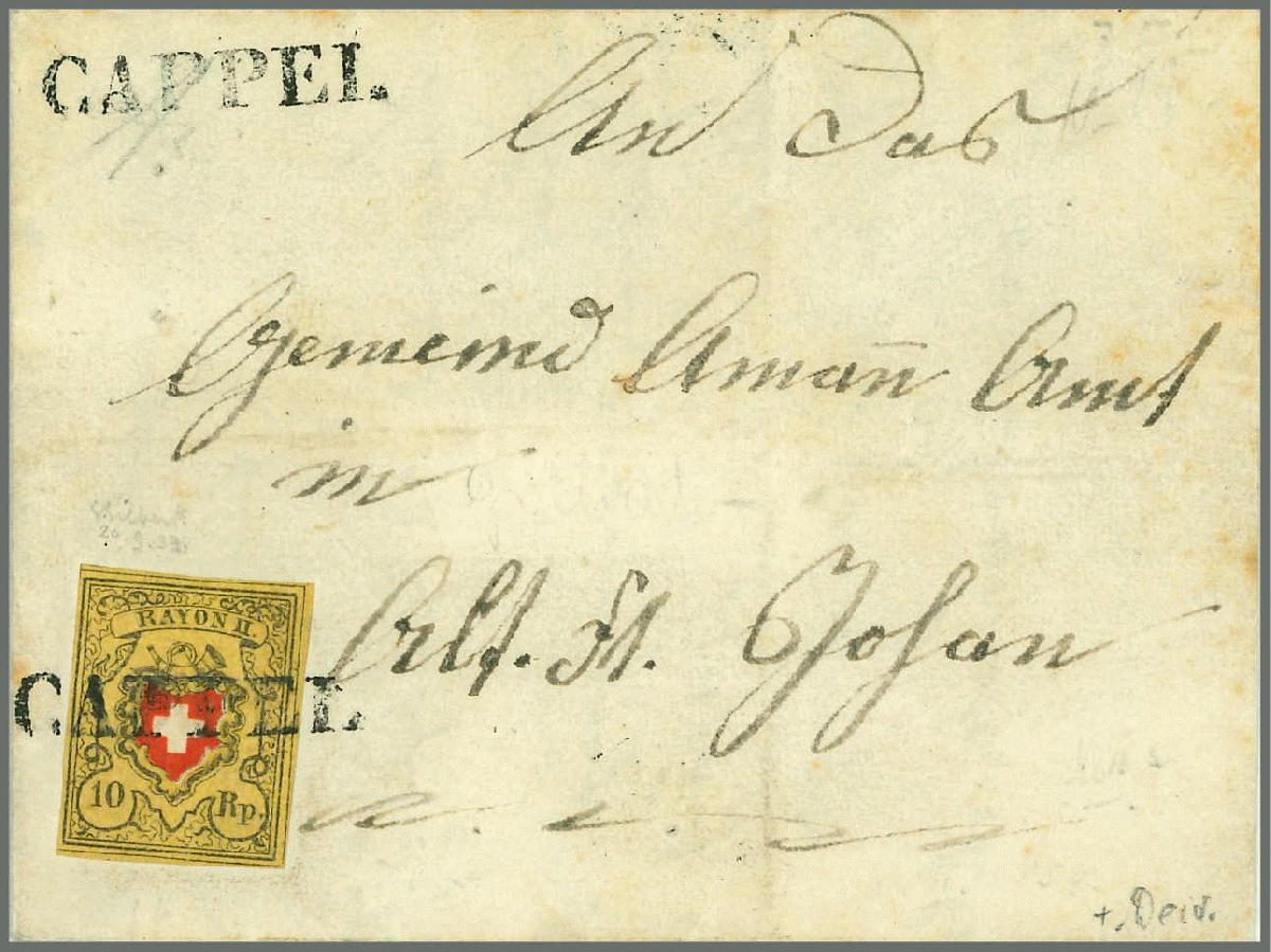 | Zusatzinformationen und Suchstichworte: | Rapp Auktion 2022 Auktionstermin: 2. - 7. Mai 2022 Los 152 Rayon II, gelb, ohne Kreuzeinfassung (Diverse) Type 16 LU, breitrandig und frisch mit klar ausgeprägtem Stabstempel CAPPEL über Marke und als Aufgabestempel auf vollständigem und schönem Brief nach Alt St. Johann. Atteste Kimmel und Eichele. Zuschlag 550,00 CHF |