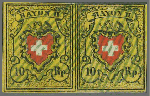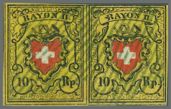 | Zusatzinformationen und Suchstichworte: | Rapp Auktion 2022 Auktionstermin: 2. - 7. Mai 2022 Los 153 Rayon II, gelb, ohne Kreuzeinfassung (Diverse) Waagrechtes Paar mit den Typen 33+34 LO, Type 33 mit Stecherzeichen, Type 34 oben entlang der Randlinie geschnitten, sonst breitrandig, frisch und sauber mit grünen Bundesrauten entwertet. Attest Eichele. Zuschlag 400,00 CHF |