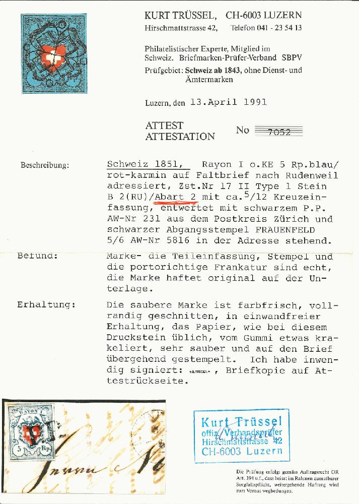 | Zusatzinformationen und Suchstichworte: | Rapp Auktion 2022 Auktionstermin: 2. - 7. Mai 2022 Los 161 Rayon I, hellblau, ohne KE (DIVERSE) Type 1 RU, ca. 5/12 Kreuzeinfassung, frisch und breitrandig mit übergehendem P.P. und Aufgabestempel FRAUENFELD 5/6 auf Brief über Bischofszell nach Ruedenwil. Atteste Trüssel und Eichele. Zuschlag 280,00 CHF |