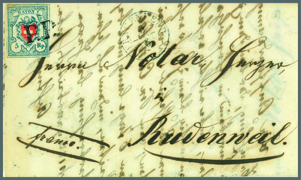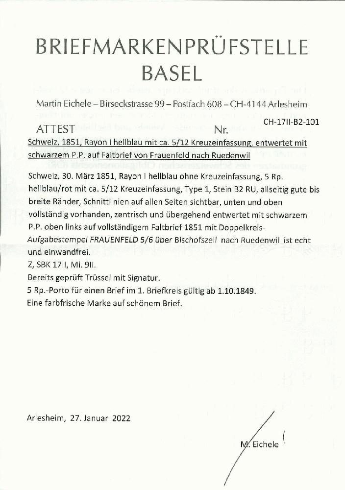 | Zusatzinformationen und Suchstichworte: | Rapp Auktion 2022 Auktionstermin: 2. - 7. Mai 2022 Los 161 Rayon I, hellblau, ohne KE (DIVERSE) Type 1 RU, ca. 5/12 Kreuzeinfassung, frisch und breitrandig mit übergehendem P.P. und Aufgabestempel FRAUENFELD 5/6 auf Brief über Bischofszell nach Ruedenwil. Atteste Trüssel und Eichele. Zuschlag 280,00 CHF |