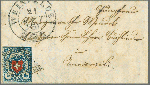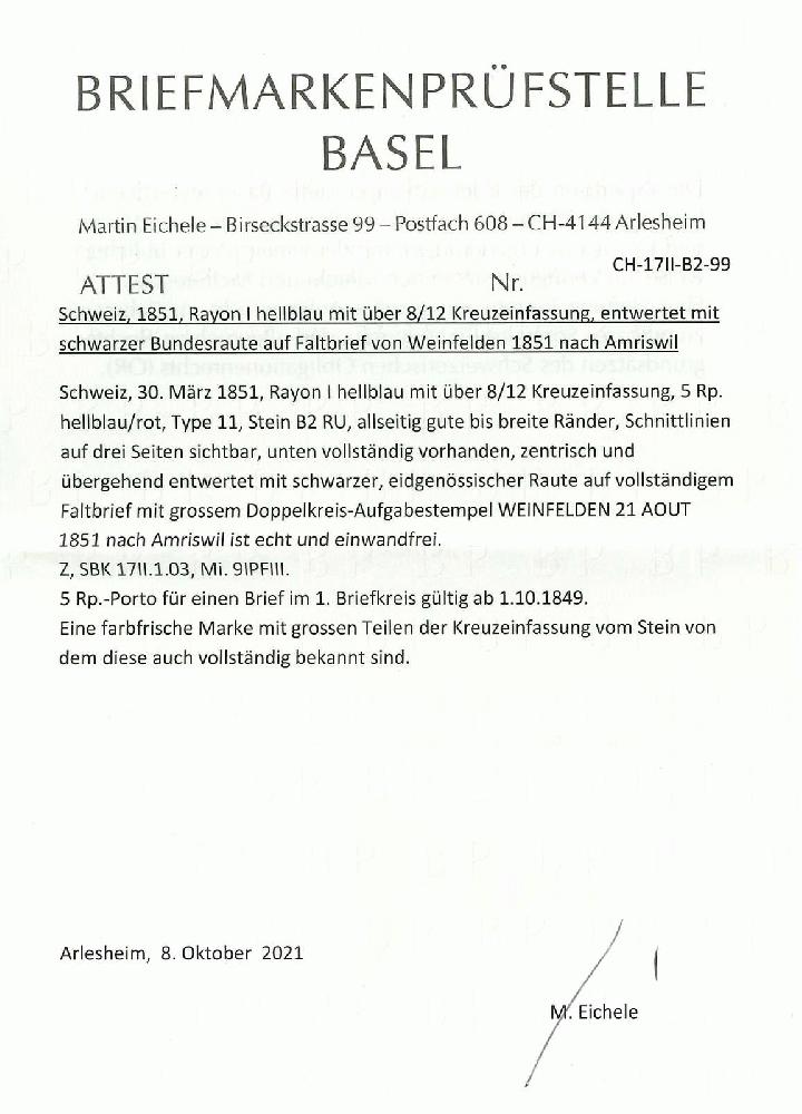 | Zusatzinformationen und Suchstichworte: | Rapp Auktion 2022 Auktionstermin: 2. - 7. Mai 2022 Los 162 Rayon I, hellblau, ohne KE (STEIN B2) Type 11 RU mit klar erkennbar über 8/12 der Kreuzeinfassung, farbenfrisch und breitrandig auf vollständigem, kleinformatigem Briefchen mit grossem Aufgabestempel WEINFELDEN 21 AOUT 1851 nach Amriswil. Vom Druckstein B2 sind auch die wenigen Exemplare mit vollständiger Kreuzeinfassung bekannt. Ein seltener Brief in tadelloser Erhaltung. Atteste Zumstein und Eichele. Zuschlag 3.000,00 CHF |