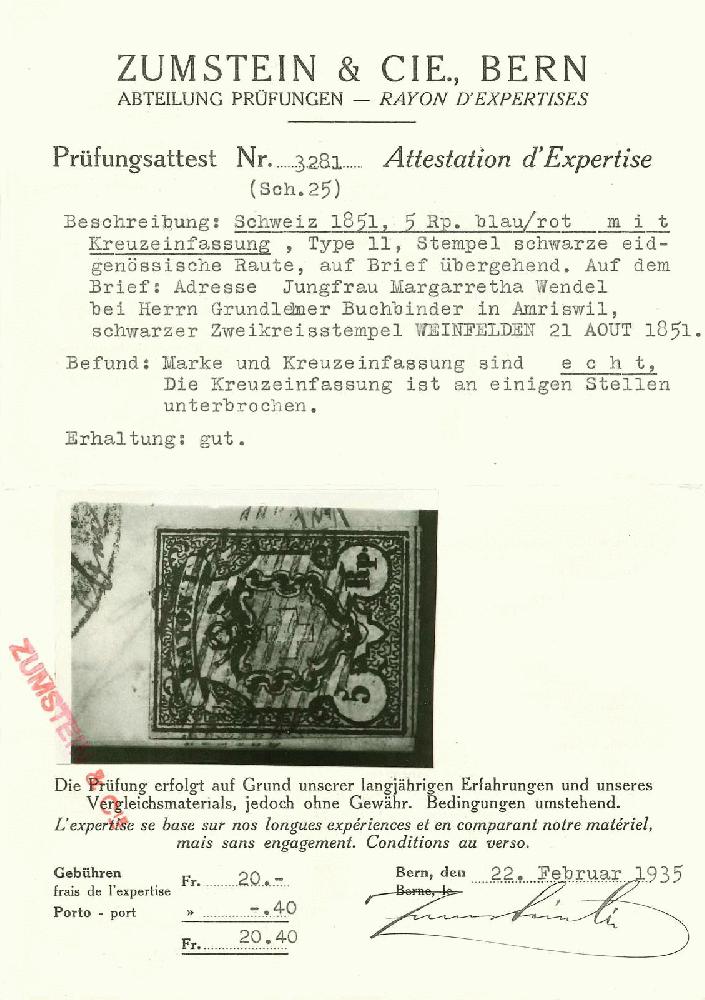| Zusatzinformationen und Suchstichworte: | Rapp Auktion 2022 Auktionstermin: 2. - 7. Mai 2022 Los 162 Rayon I, hellblau, ohne KE (STEIN B2) Type 11 RU mit klar erkennbar über 8/12 der Kreuzeinfassung, farbenfrisch und breitrandig auf vollständigem, kleinformatigem Briefchen mit grossem Aufgabestempel WEINFELDEN 21 AOUT 1851 nach Amriswil. Vom Druckstein B2 sind auch die wenigen Exemplare mit vollständiger Kreuzeinfassung bekannt. Ein seltener Brief in tadelloser Erhaltung. Atteste Zumstein und Eichele. Zuschlag 3.000,00 CHF |