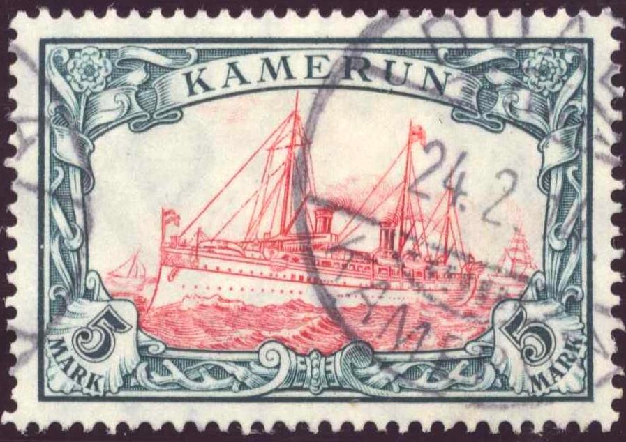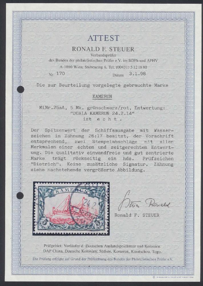 | Zusatzinformationen und Suchstichworte: | Auktionshaus Weiser 770. Auktion Auktionstermin: 1. - 2. Juli 2022 Los 1027 Deutsche Kolonien Kamerun Deutsche Kolonien / Kamerun 1905, 5 Mk.-Kaiser-Yacht, mit Wz.1, gez. 26:17, Kabinettstück mit Stempel 'DUALA KAMERUN24.2.14', es ist der Spitzenwert der Schiffsausgaben (!), Foto-Attest Steuer BPP (gest., Mi.-Nr. 25 I A, Mi.EUR 4.800,--) (2002) Zuschlag 1.080,00 EUR |