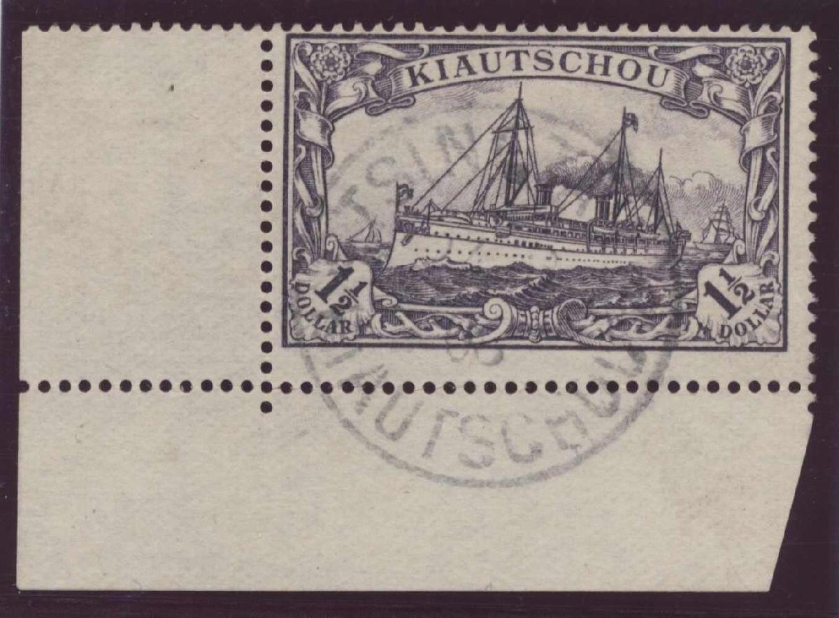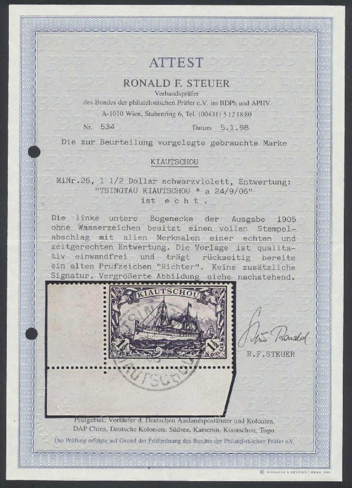 | Zusatzinformationen und Suchstichworte: | Auktionshaus Weiser 770. Auktion Auktionstermin: 1. - 2. Juli 2022 Los 1035 Deutsche Kolonien Kiautschou Deutsche Kolonien / Kiautschou 1905, Kaiser-Yacht, 1 1/2 Dollar, ohne Wz., feinstes Kabinettstück aus der linken unteren Bogenecke, mit Stempel 'TSINGTAU KIAUTSCHOU * a 24/09/06', Altsignatur Richter, Foto-Attest Steuer BPP (gest., Mi.-Nr. 26 A, Mi.EUR 2.000,--+) (2002) Zuschlag 460,00 EUR |