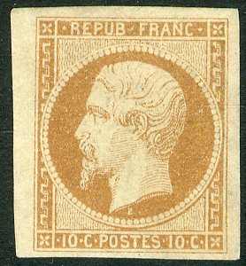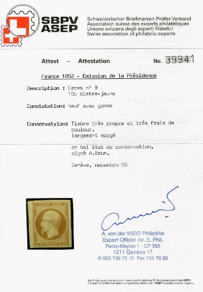| Zusatzinformationen und Suchstichworte: | 117. Veuskens Auktion Auktionstermin: 1. - 2. Juli 2022 Los 639 Frankreich 10 C. Freimarke Präsident Louis Napoleon 1852, sog. 'Presidence', mit Inschrift 'Repub. Franc.', in a.-Farbe (gelbbraun). Bei der hier angebotenen Marke handelt es sich um ein ungebrauchtes Stück mit vollem, praktisch postfrischem Originalgummi! Die Marke ist außerordentl. breitrandig geschnitten und stammt vom linken Bogenrand. Sie besticht durch ihre große farbfrische und ihre wirklich unglaubl. schöne Qualität. Es handelt sich hierbei um eine Frankreich-Seltenheit und ohne Übertreibung sicher um eines der schönsten Exemplare dieser Marke, Welt-Seltenheit. Gepr. Brun, Calves und Attest von der Weid (Schweizer Prüferveband). Auch schönes Anlagestück, Luxus. M€ für ungebraucht bereits 35.000,--, postfrisch so gut wie nicht existent. Ausruf 10.000,00 EUR |