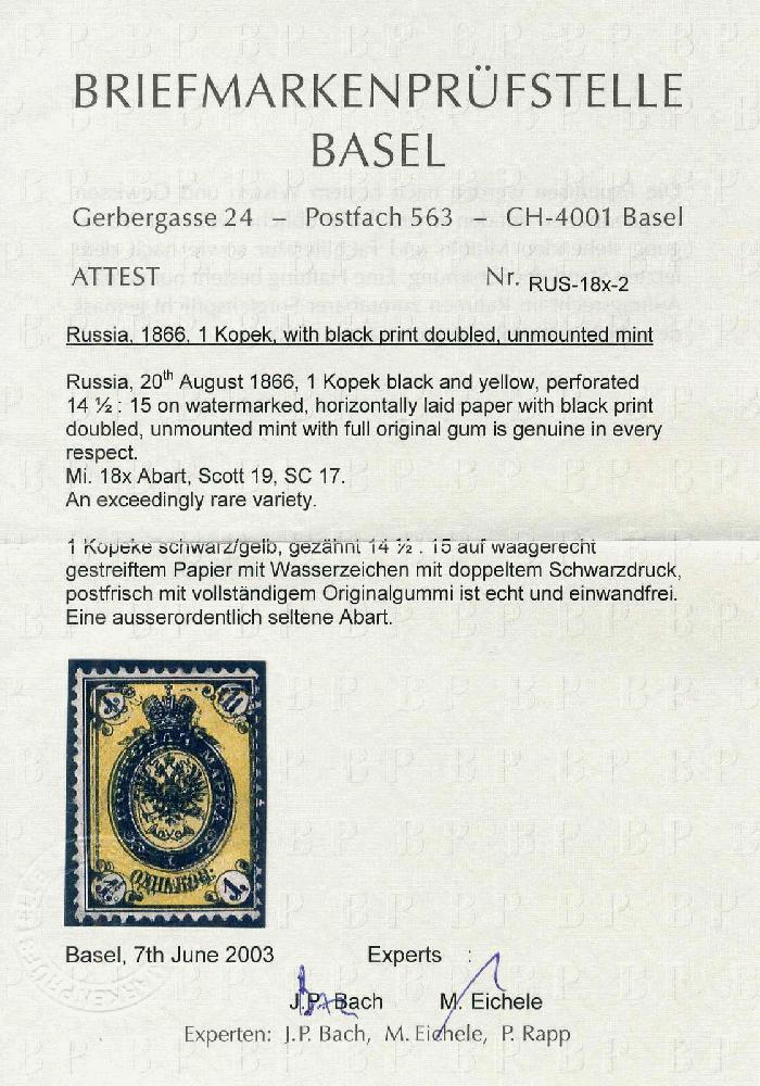 | Zusatzinformationen und Suchstichworte: | 117. Veuskens Auktion Auktionstermin: 1. - 2. Juli 2022 Los 889 Russland 1 Kop. Freimarke 'Staatswappen-Posthörner ohne Blitze' 1866, schwarz/gelb, auf waager. gestreiftem Papier mit Wz., mit doppeltem Schwarzdruck (!). Die uns bisher nie vorgelegene Marke tadellos psotfrisch mit vollständigem Originalgummi. Mit Attest der Briefmarkenprüfstelle Basel 'echt und einwandfrei'. Es handelt sich hierbei ohne Zweifel um eine außerordentl. seltene Abart. Aus der Sammlungs-Übernahme der großen Schweizer Sammlung. Zuschlag 750,00 EUR |