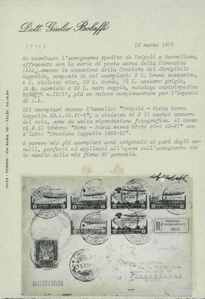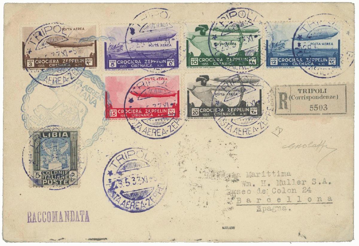 | Zusatzinformationen und Suchstichworte: | Ulrich Felzmann 175. Auktion Auktionstermin: 30. Juni 2022 Los 3096 Italienisch Cyrenaica Italienfahrt 1933 Rückfahrt und 2. Südamerikafahrt, Abwurf Barcelona, Cyrenaica Post, R-Brief ab Tripoli 29.5. mit allen sechs Werten Zeppelin komplett, Transit-SST Rom 29.5. und vs. blauer Flugstempel der Italienfahrt, keine weitere Transite und rs. Ankunft Barcelona 4.6., minimale Bedarfsspuren, Attest Bolaffi (Longhi 323 - ca. 12.000 €) Zuschlag 1.100,00 EUR |