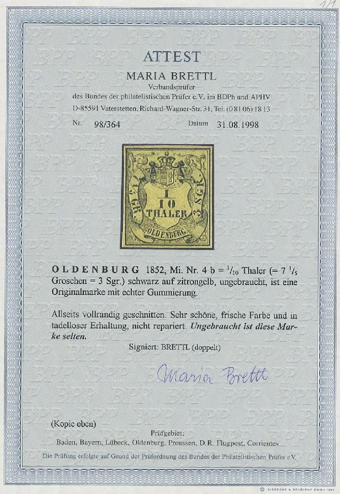 | Zusatzinformationen und Suchstichworte: | Ulrich Felzmann 175. Auktion Auktionstermin: 30. Juni 2022 Los 5080 Altdeutschland Oldenburg 3 Sgr auf hellgraugelb, ungebraucht mit Originalgummi, ringsum voll- bis breitrandig in farbfrischer Kabinetterhaltung, doppelt signiert und zweifach attestiert Brettl BPP bzw. Stegmüller BPP "Ungebrauchte Exemplare dieser Marke sind selten" Zuschlag 2.100,00 EUR |