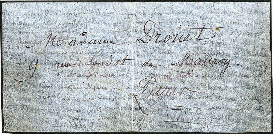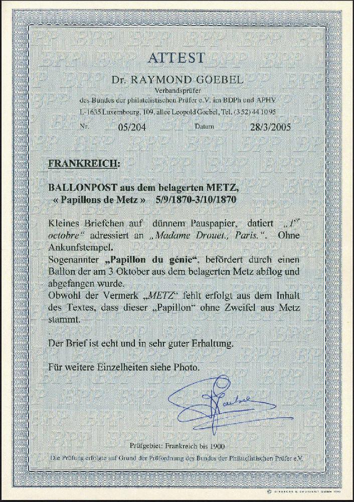 | Zusatzinformationen und Suchstichworte: | Götz 398. Auktion Auktionstermin: 22. - 23. Juni 2022 Los 2257 Frankreich Papillons de Metz, kleines Briefchen auf dünnem Papier, adressiert an Madame Drouet in Paris. Gemäss Attest Dr.Goebel handelt es sich um einen sogenannten "Papillon du génie", befördert durch einen Ballon, der am 3. Oktober aus dem belagerten Metz abflog u. abgefangen wurde. Desweiteren schreibt der Prüfer: "Der Brief ist echt und in sehr guter Erhaltung" Ausruf 600,00 EUR |