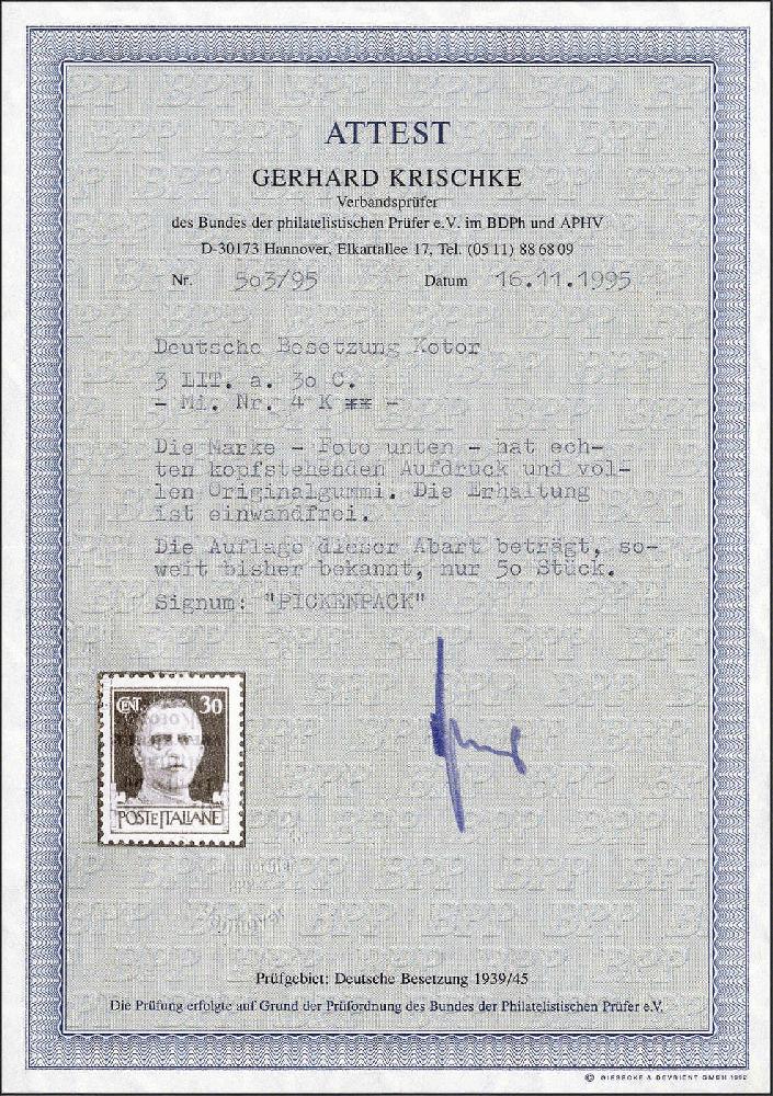 | Zusatzinformationen und Suchstichworte: | Götz 398. Auktion Auktionstermin: 22. - 23. Juni 2022 Los 3416 Deutsche Besetzung II. WK Kotor 3 Lit. a. 30 C. schwarzbraun mit kopfstehendem Überdruck tadellos **, seltene Abart, von welcher lediglich 1 Bogen von 50 Exemplaren bekannt geworden ist, geprüft Pickenpack bzw. Attest Krischke "einwandfrei". Mi. 1.500,- EUR Zuschlag 320,00 EUR |