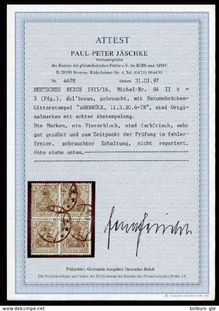 | Zusatzinformationen und Suchstichworte: | Delcampe.net Deutsches Reich 4er Block 84 IIb gestempelt Attest Jäschke #HF153 Artikel n° #1551411421 Festpreis 149,00 EUR |