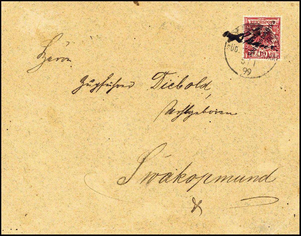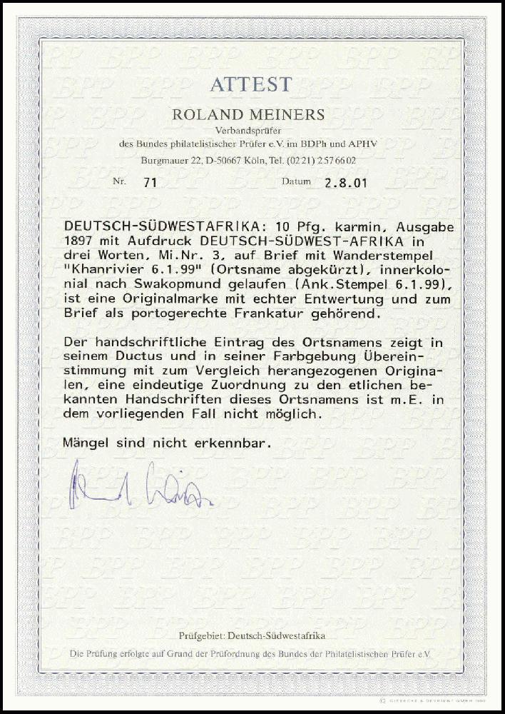 | Zusatzinformationen und Suchstichworte: | Württembergisches Auktionshaus 140. Versteigerung Auktionstermin: 18. Juni 2022 Los 6773 Deutsche Kolonien Südwestafrika "Khanr.", hs. (Siebert Nr.3) mit Wanderstempel vom 6/1 99 auf seltenem Inlands-Bedarfsbrief 10 Pfg. nach Swakopmund mit Eingangsstempel. Die Handschrift dieser Entwertung entspricht der Aufstellung von Werner Siebert unter Nr.3, während lt. Attest Meiners BPP eine eindeutige Zuordnung zu den bekannten Handschriften nicht möglich ist. Ausruf 200,00 EUR |
