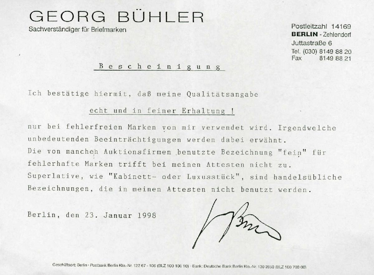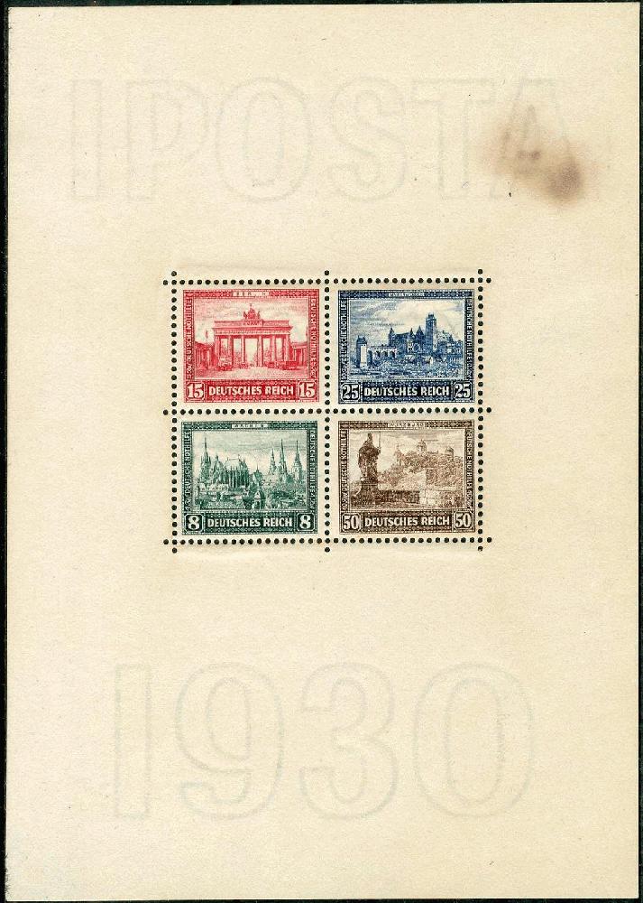 | Zusatzinformationen und Suchstichworte: | 117. Veuskens Auktion Auktionstermin: 1. - 2. Juli 2022 Los 1720 Deutsches Reich, 1923/32 Weimarer Republik IPOSTA-Block 1930, der Block in den Originalmaßen, tadellos postfrisch, allerdings oben rechts mit größerem Altersfleck. Dem Los liegt ein Alt-Attest von Georg Bühler bei, der dem Block 1998 noch ein Einwandfrei-Attest ausgestellt hat, bitte urteilen Sie selbst. M€ für postfrischen Block 1.600,-- Zuschlag 170,00 EUR |