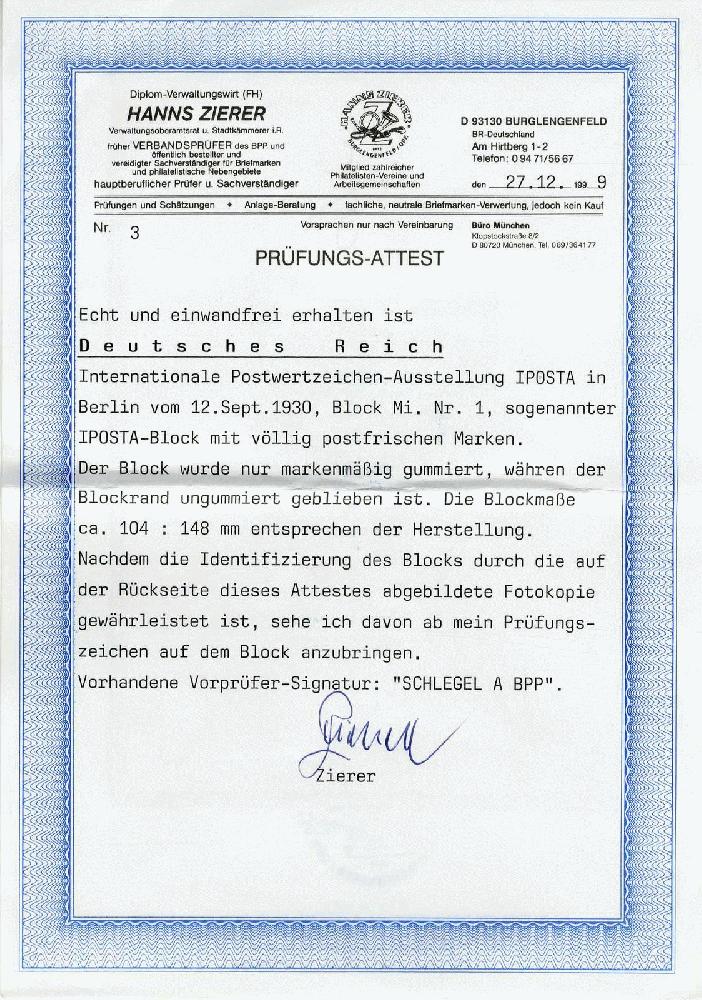 | Zusatzinformationen und Suchstichworte: | 117. Veuskens Auktion Auktionstermin: 1. - 2. Juli 2022 Los 1721 Deutsches Reich, 1923/32 Weimarer Republik IPOSTA-Block 1930, in den Originalmaßen, tadellos postfrisch. Gepr. Schlegel BPP und zusätzl. Attest Zierer, Pracht. M€ 1.600,-- Zuschlag 330,00 EUR |