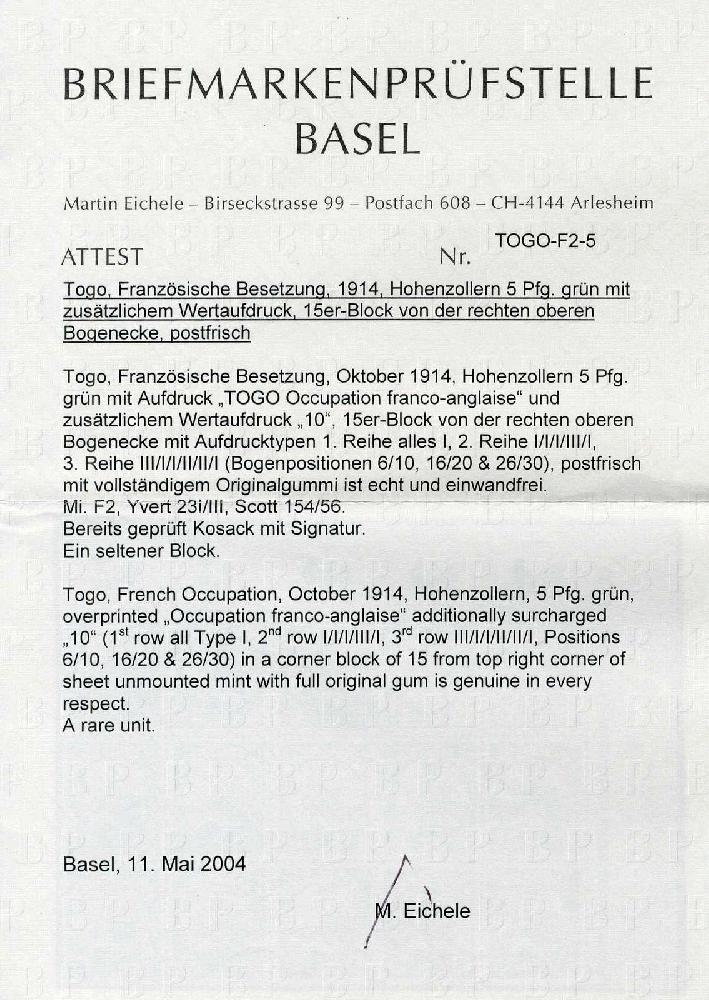 | Prüfgebiet: | Deutsche Kolonien Togo Französische Besetzung |