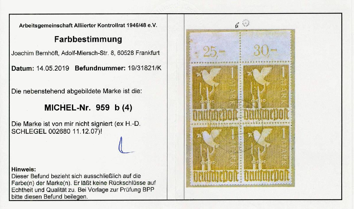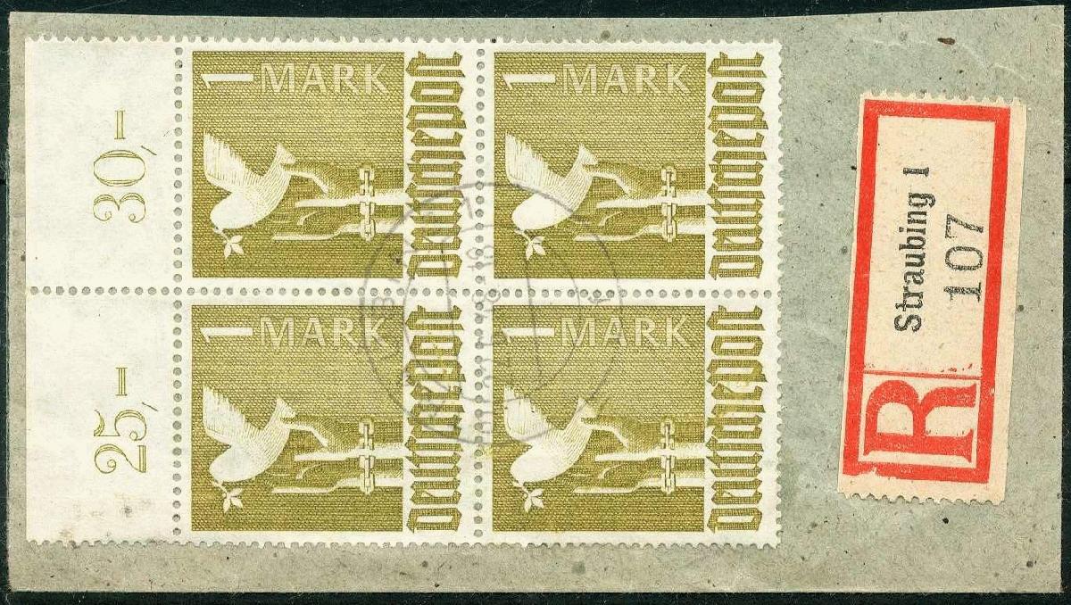 | Zusatzinformationen und Suchstichworte: | 117. Veuskens Auktion Auktionstermin: 1. - 2. Juli 2022 Los 2580 Gemeinschaftsausgaben 1 Mark Friedenstaube 1947, in b.-Farbe, Viererblock vom Oberrand auf R.-Brief von 'Straubing 22.6.1948' mit Farbbestimmung Bernhöft (das in der Farbbestimmung erwähnte Attest Schlegel aus 2007 ist leider verloren gegangen). M€ 3.000,-- Ausruf 500,00 EUR |