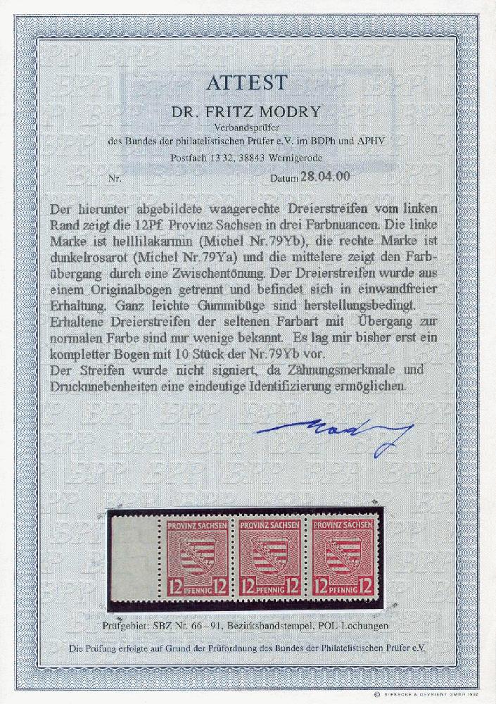 | Zusatzinformationen und Suchstichworte: | 117. Veuskens Auktion Auktionstermin: 1. - 2. Juli 2022 Los 2741 SBZ Provinz Sachsen 12 Pf. Provinzwappen 1945, mit Wz1Y., in b.-Farbe, mit linkem Seitenrand, tadellos postfrisch, mit Farbfotoattest Dr. Modry BPP, der einen ehemal. Dreierstreifen attestierte, Pracht. M€ 700,--+ Ausruf 190,00 EUR |