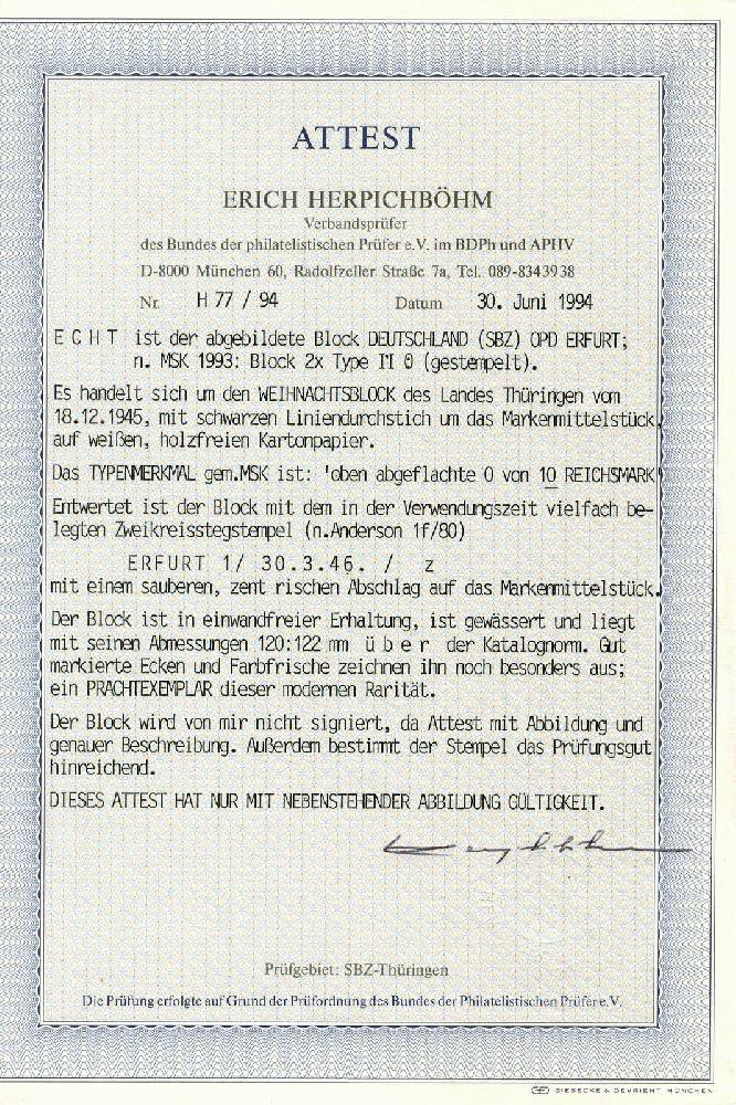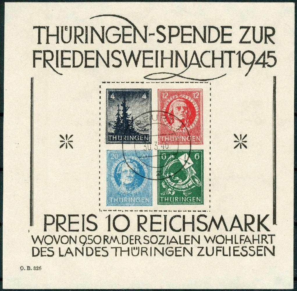 | Zusatzinformationen und Suchstichworte: | 117. Veuskens Auktion Auktionstermin: 1. - 2. Juli 2022 Los 2822 SBZ Thüringen Weihnachts-Block 1945, auf x.-Papier (weißes, getöntes, holzfreies Kartonpapier mit gestrichener Gummierung), sauber zentr. und schön gest. 'Erfurt 1 30.3.46 z', farbfrisch, in den Originalmaßen. Mit Attest Herpichböhm BPP 'echt und einwandfrei', Luxus. M€ 4.000,--+ Ausruf 1.200,00 EUR |