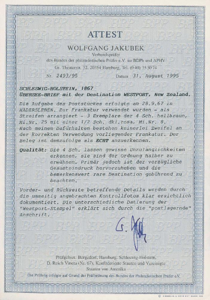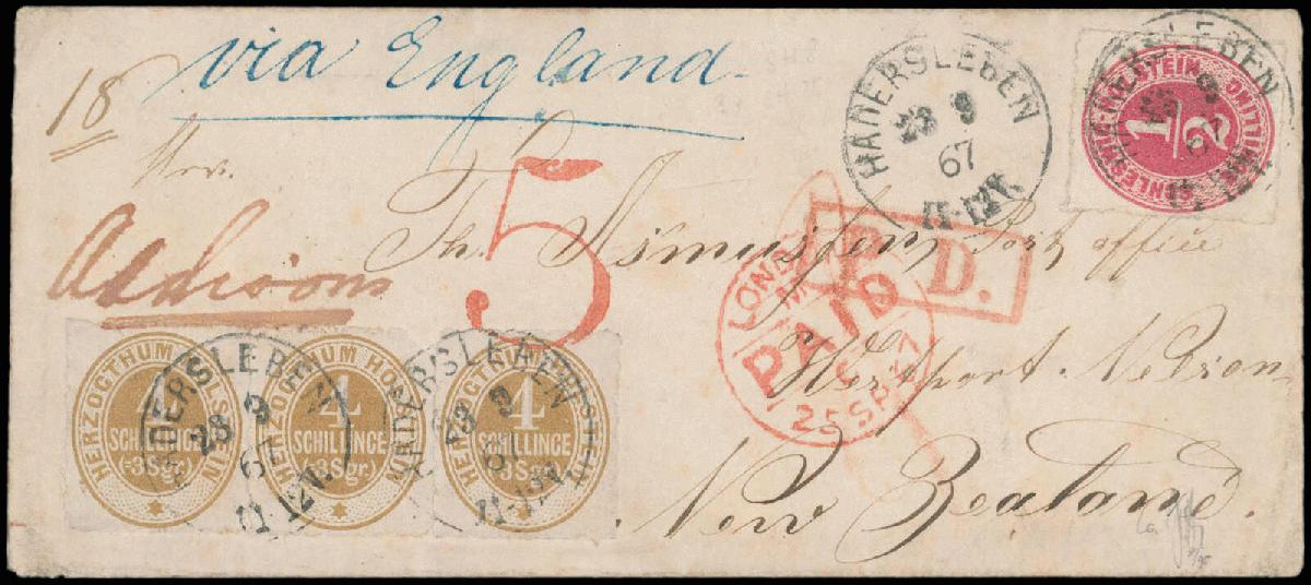 | Zusatzinformationen und Suchstichworte: | 3. Sellschopp Auktion Auktionstermin: 11. Juni 2022 Los 497 Altdeutschland Schleswig Holstein 1865/67, Inschrift "SCHLESWIG-HOLSTEIN" 1/2 Schilling dunkelrosa, farbfrisches Kabinettstück, in Kombination mit Ausgabe "HERZOGTHUM HOLSTEIN" 4 Schilling hellbraun im waagerechten Dreierstreifen (dieser teils kleinere unauffällige Randfehler), mit sauberen K1 "HADERSLEBEN 28 9 67" auf kleinem Briefkuvert nach Westport, Neuseeland, mit Leitvermerk "via England" in blauer Tinte, mit vorderseitig rotem "P.D." und Transit-K1 "LONDON PAID" sowie Tax-Stempel "5" und rückseitig ebenfalls sauberem Ankunft-K1 "WESTPORT NZ DE 1 67". Portoberechnung: 12 1/2 Schilling Courant-Frankatur auf Brief in der 1. Gewichtsstufe über Preußen, Belgien und GB. Da im annektierten Schleswig ab 1. Januar 1867 für Briefe, die durch Preußen an das Ausland weitergeleitet wurden, preußische Tarife anzuwenden waren, betrug das Gesamtporto 9 1/4 Silbergroschen, wie nach Australien. Briefe nach Neuseeland konnten jedoch bis zum Bestimmungsort bezahlt werden (vgl. P.D.-Stempel). Der an England zu vergütende Anteil von 6 3/4 Silbergroschen wurde umgerechnet in 8 Pence, wobei hier das Seeporto von England nach Neuseeland in Höhe von 5 Pence (= 4 1/2 Silbergroschen) durch einen roten Stempel gesondert ausgewiesen wurde. Das Porto ist dargestellt durch drei Marken zu 4 Schilling Courant (= 3 Silbergroschen) sowie eine Marke zu 1/2 Schilling Courant, welche in etwa 4,5 Silberpfennigen, also etwas mehr als 1/3 Silbergroschen, entsprach - eine kleinere Wertstufe gab es in Schleswig-Holstein aber nicht. Ein besonders dekorativer, extrem seltener und mit der Verwendung der HOLSTEIN-Marken in Schleswig wohl einmaliger Brief in diese exotische Destination. Ein Spitzenbrief sowohl für eine große Schleswig-Holstein-, aber auch eine anspruchsvolle Preußen- oder Neuseeland-Postgeschichts-Sammlung. Fotoattest Wolfgang Jakubek BPP. Zuschlag 26.000,00 EUR |