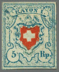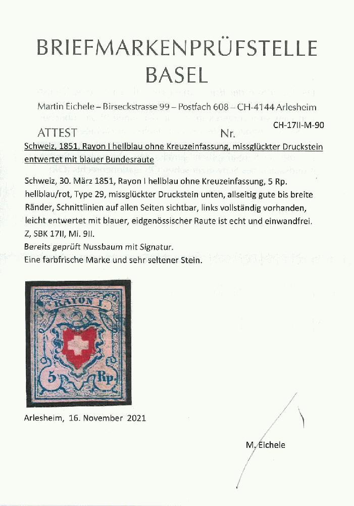 | Zusatzinformationen und Suchstichworte: | Rapp Auktion 2022 Auktionstermin: 2. - 7. Mai 2022 Los 166 Rayon I, hellblau, ohne KE (DIVERSE) Type 29 von der unteren Gruppe, breitrandig und frisch mit sehr leichter Bundesraute, das Kreuz völlig freilassend. Seltene und tadellos erhaltene Marke. Atteste Nussbaum und Eichele. Zuschlag 1.800,00 CHF |