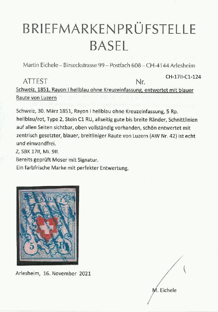 | Zusatzinformationen und Suchstichworte: | Rapp Auktion 2022 Auktionstermin: 2. - 7. Mai 2022 Los 170 Rayon I, hellblau, ohne KE (DIVERSE) Type 2 RU, frisch und perfekt erhalten mit blauer Luzerner-Raute. Atteste Moser und Eichele. Zuschlag 180,00 CHF |