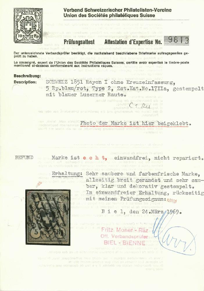 | Zusatzinformationen und Suchstichworte: | Rapp Auktion 2022 Auktionstermin: 2. - 7. Mai 2022 Los 170 Rayon I, hellblau, ohne KE (DIVERSE) Type 2 RU, frisch und perfekt erhalten mit blauer Luzerner-Raute. Atteste Moser und Eichele. Zuschlag 180,00 CHF |