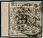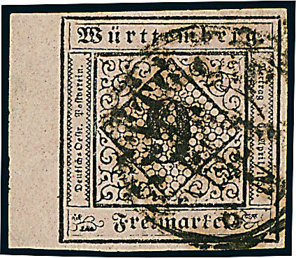 | Zusatzinformationen und Suchstichworte: | Dr. Derichs 5. Online Live Auktion Auktionstermin: 10. Juli 2022 Los 2062 Altdeutschland Württemberg 9 Kr. schw./lebhaftrosa, gute "b"-Farbe, linkes Randstück mit 5mm breitem Bogenrand, auch an den anderen drei Seiten voll- bis breitrandig, mit schwarzem K3 "Stuttgart". Kabinett. Attest Dr. Hederer BPP und Fotobefund Irtenkauf BPP: "einwandfrei" Ausruf 100,00 EUR |