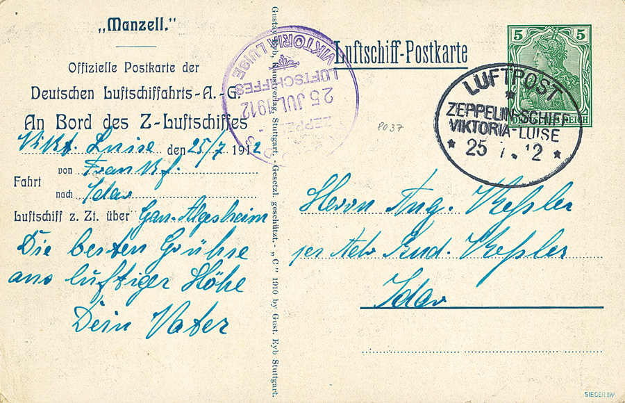 | Zusatzinformationen und Suchstichworte: | 112. Kirstein-Larisch Auktion Auktionstermin: 9. - 11. Juni 2022 Los 797 Deutsches Reich 1912, LZ 11 "VIKTORIA LUISE", Rundflug Frankfurt- Idar Oberstein- Frankfurt, Pracht- Zeppelin- Sonder-GA Germania 5 Pf. grün (leichte Lagersp.) mit Bordpoststpl. "LUFTPOST * ZEPPELIN-SCHIFF VIKTORIA-LUISE 25.7.12" u. Bordstpl. "AN BORD DES ZEPPELIN-LUFTSCHIFFES VIKTORIA-LUISE 25 JUL 1912", Attest Sieger, Si. 4 xa Zuschlag 210,00 EUR |