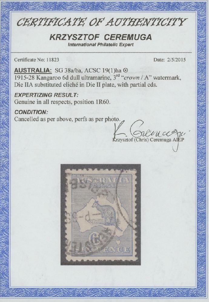 | Zusatzinformationen und Suchstichworte: | 248. Abacus Auktion Auktionstermin: 20. - 22. Juli 2022 Los 207 Australien - Känguruhs - drittes Wasserzeichen 6d matt ultramarin Austauschklischee ACSC 19 (1) ja (SG 38a) mit senkrechtem Randwasserzeichen Linie rechts, außergewöhnlich Zentrierung, ein paar etwas kurz Zähne, Einschreiben/BRISBANE Kreisdatumsstempel frei von die tell-tale zerbrechen im L/H Seitenrand, Katalogwert $3750 (£1900). Chris Ceremuga Attest (2015) Ausruf 750,00 AUD |
