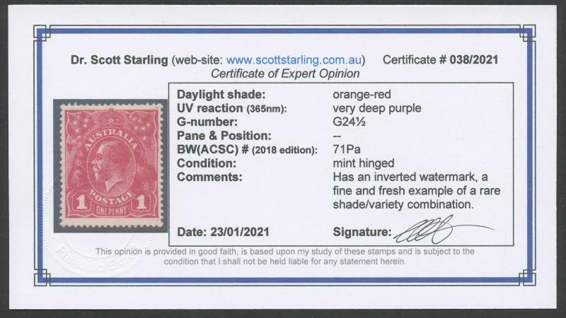 | Zusatzinformationen und Suchstichworte: | 248. Abacus Auktion Auktionstermin: 20. - 22. Juli 2022 Los 338 Australien - KGV - Single Watermark 1d orangerot glatt Papierwasserzeichen kopfstehend ACSC 71Pa, Katalogwert $750, Scott Stare Attest (2020) Bundesländer "eine schöne und frisches Stück einer seltener Farbton Kombination" Ausruf 190,00 AUD |